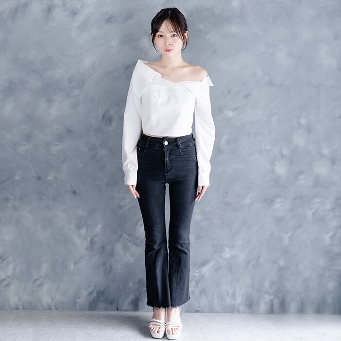オフショルダーが大人っぽい雰囲気のビスチェ風シャツ。
